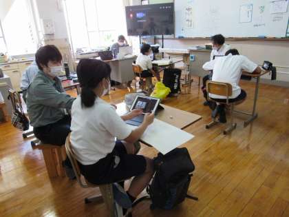 1組の社会の授業では、「京都市のおすすめスポットを紹介しよう」というテーマの続きの授業で,GIGA端末で調べたことを画用紙にまとめました。