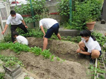 1組の生活の授業では、これまで育ててきた「ほうれん草」「水菜」「枝豆」「人参」の周りの草取りや「水菜」の間引きをしました。