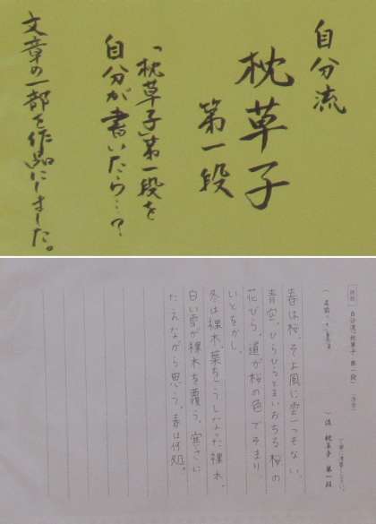 2年生の国語の単元「枕草子」において,「自分流の“枕草子”を完成させよう」というテーマで,枕草子を自分流にアレンジして,これを清書したものを廊下に掲示しています。