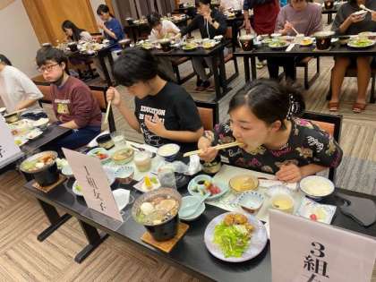 また豪華なな夕食風景です。今日一日,いろいろな体験をして,お腹もすいたことでしょう。夜のレクに備えて,たくさん食べてください。