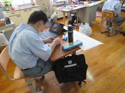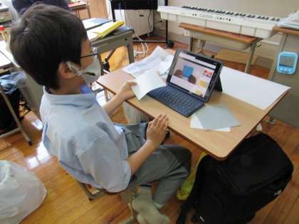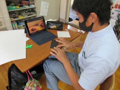 1組の生活の授業では、今,修学旅行中の1組担任のH先生やK先輩に向けて,修学旅行に因んだ折り紙を添えたメッセージカードの制作に取り組みました。