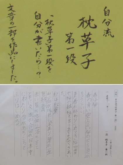 2年生の国語の単元「枕草子」において,「自分流の“枕草子”を完成させよう」というテーマで,枕草子を自分流にアレンジして,これを清書したものを廊下に掲示しています。