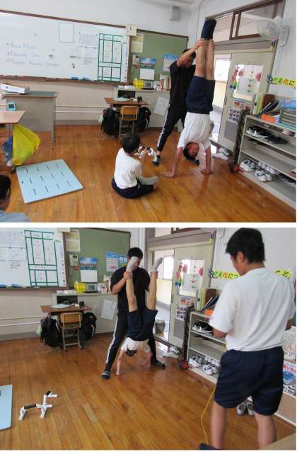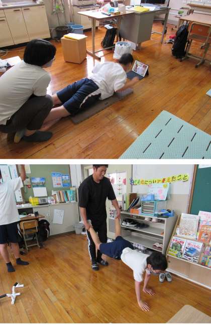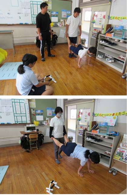 1組の生活の授業では、背筋運動,逆立ち,手押し車などで,筋力トレーニングをしました。