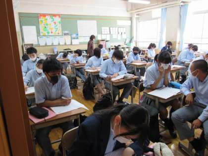 3年3組の英語の授業では、修学旅行の思い出をペアで話し合って,英語で日記にしました。いい思い出が多すぎて,時間内に仕上げられなかったのでは^^);