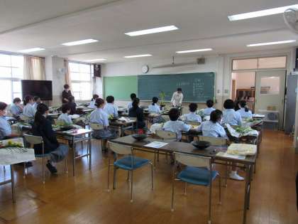 昨日(2日),1年生伝統文化体験生け花教室を池坊の講師,冨尾先生にお越しいただき,各クラス2時間ずつの設定で実施しました。