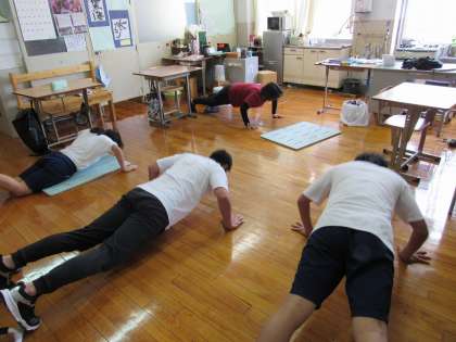 1組の生活の授業では,「体の使い方」をテーマに,きんにくんTVなどの動画に合わせて体幹トレーニングをしました。