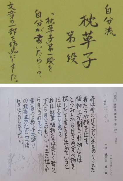 2年生の国語の単元「枕草子」において,「自分流の“枕草子”を完成させよう」というテーマで,枕草子を自分流にアレンジして,これを清書したものを廊下に掲示しています。