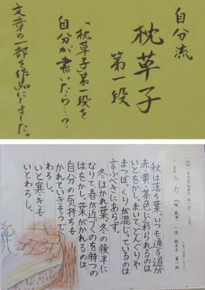 2年生の国語の単元「枕草子」において,「自分流の“枕草子”を完成させよう」というテーマで,枕草子を自分流にアレンジして,これを清書したものを廊下に掲示しています。