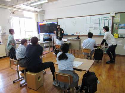 1組の英語の授業では、ALTの先生と「動詞のカード」を使って学んだり,知っている英単語を生徒同士で言い合ったりして,語彙を増やしました。