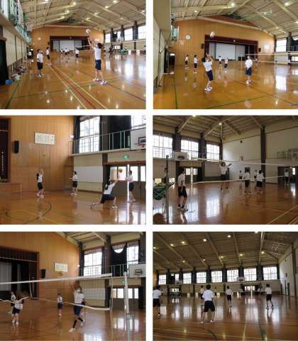 3年3組の体育の授業では、バレーボールの技術練習(サーブ,スパイク…など)を行った後,ミニゲームをしました。