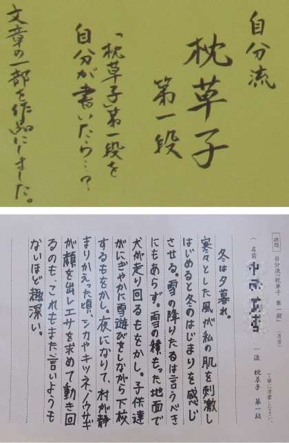 2年生の国語の単元「枕草子」において,「自分流の“枕草子”を完成させよう」というテーマで,枕草子を自分流にアレンジして,これを清書したものを廊下に掲示しています。