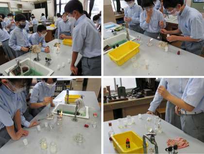 1年2組の理科の授業では、「白い粉を性質から判定しよう」というテーマで,燃焼実験や石灰水に混ぜてみたりする実験,ヨウ素デンプン反応などから,それが「片栗粉」「食塩」「砂糖」の内のどの物質かを考えました。