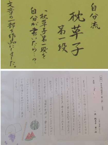 2年生の国語の単元「枕草子」において,「自分流の“枕草子”を完成させよう」というテーマで,枕草子を自分流にアレンジして,これを清書したものを廊下に掲示しています。