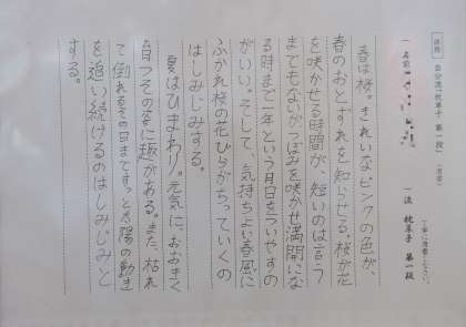 2年生の国語の単元「枕草子」において,「自分流の“枕草子”を完成させよう」というテーマで,枕草子を自分流にアレンジして,これを清書したものを廊下に掲示しています。