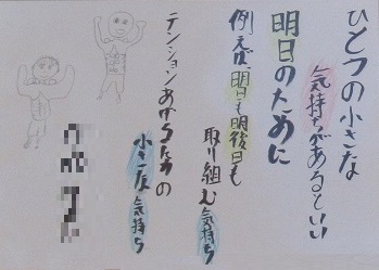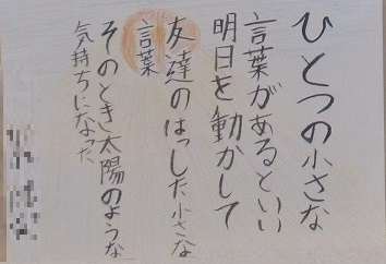 1年生の国語の単元で「谷川俊太郎さんの詩“明日”の一連を創作しよう」というテーマで創作したみなんさんの作品「ひとつの小さな〇〇があるといい」を廊下に掲示しています。