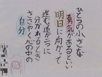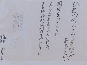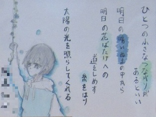 1年生の国語の単元で「谷川俊太郎さんの詩“明日”の一連を創作しよう」というテーマで創作したみなんさんの作品「ひとつの小さな〇〇があるといい」を廊下に掲示しています。