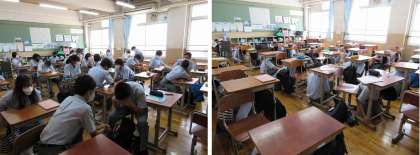 「揺れが収まりました。生徒のみなさんは、周囲の安全を確認しながら、周囲の先生の指示に従ってください。」との放送が入るまで,みんな身じろぎひとつしません。