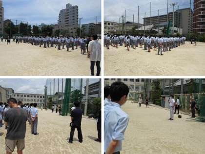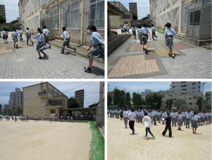 整列が終わると、安全主任のH先生から,災害避難に際しての注意ポイントとして「倒壊」,「津波」,「火事」を挙げて説明がありました。