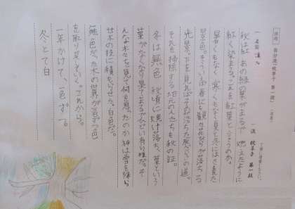 2年生の国語の単元「枕草子」において,「自分流の“枕草子”を完成させよう」というテーマで,枕草子を自分流にアレンジして,これを清書したものを廊下に掲示しています。
