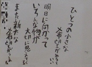 1年生の国語の単元で「谷川俊太郎さんの詩“明日”の一連を創作しよう」というテーマで創作したみなんさんの作品「ひとつの小さな〇〇があるといい」を廊下に掲示しています。