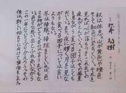 2年生の国語の単元「枕草子」において,「自分流の“枕草子”を完成させよう」というテーマで,枕草子を自分流にアレンジして,これを清書したものを廊下に掲示しています。