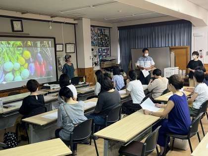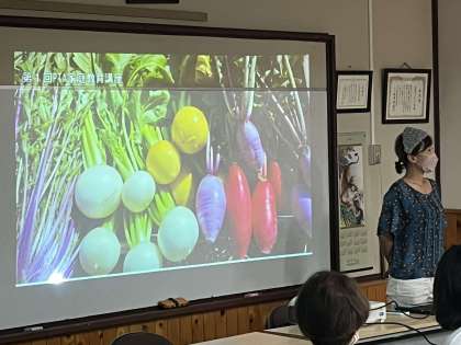 今回は、校区内にある自然派野菜を取り扱う八百屋と食堂「ベジサラ舎」を営む、中本千絵さんにお越しいただき、ご講演をいただきました。