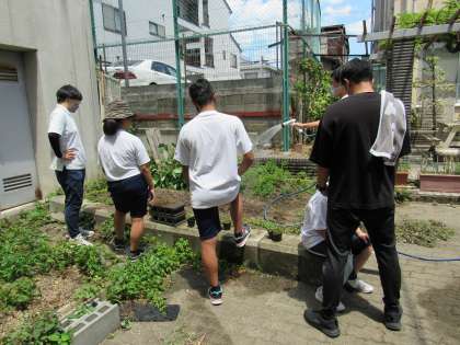 1組の生活の授業では、栽培している「人参」と「枝豆」に水やりし、周りの草取りをしました。