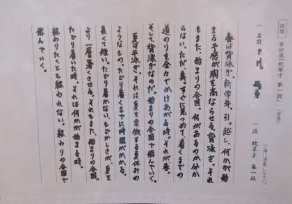 2年生の国語の単元「枕草子」において,「自分流の“枕草子”を完成させよう」というテーマで,枕草子を自分流にアレンジして,これを清書したものを廊下に掲示しています。