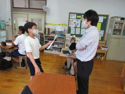 1組の社会の授業では、夏休みの課題の一つである「昭和のくらしを調べよう」の準備として、昭和の時代を生きてきた人へのインタヴュー活動の練習をしました。