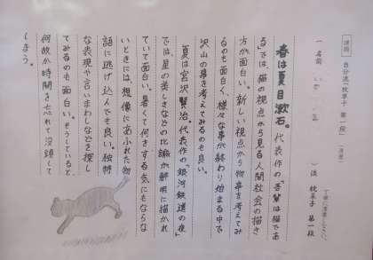 2年生の国語の単元「枕草子」において,「自分流の“枕草子”を完成させよう」というテーマで,枕草子を自分流にアレンジして,これを清書したものを廊下に掲示しています。