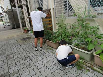 1年生は、昨日、発表しているので、この時間、栽培している野菜への水やりと周辺の草取りをしました。