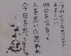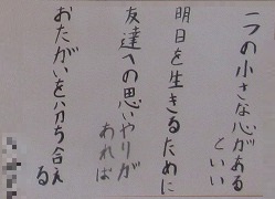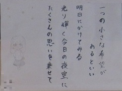 1年生の国語の単元で「谷川俊太郎さんの詩“明日”の一連を創作しよう」をテーマにして創作したみなんさんの作品「ひとつの小さな〇〇があるといい」を廊下に掲示しています。