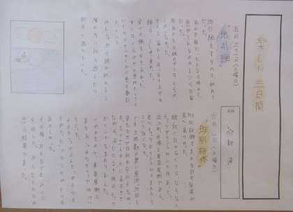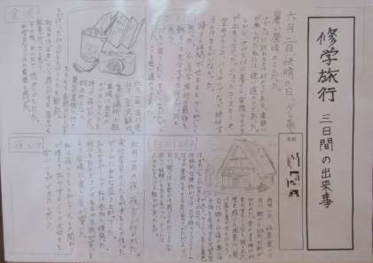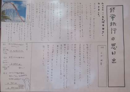 3年生の国語の単元で「文章の種類を選んで書こう」という課題に取り組み、「修学旅行」を題材として、「伝えること」「表現すること」を考え、ふさわしい文章の種類や構成を選んで「修学旅行記」としてまとめた作品を学年の廊下に掲示しています。