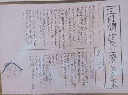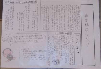 3年生の国語の単元で「文章の種類を選んで書こう」という課題に取り組み、「修学旅行」を題材として、「伝えること」「表現すること」を考え、ふさわしい文章の種類や構成を選んで「修学旅行記」としてまとめた作品を学年の廊下に掲示しています。