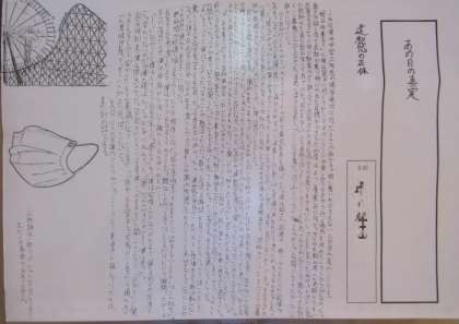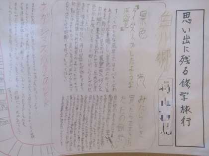 3年生の国語の単元で「文章の種類を選んで書こう」という課題に取り組み、「修学旅行」を題材として、「伝えること」「表現すること」を考え、ふさわしい文章の種類や構成を選んで「修学旅行記」としてまとめた作品を学年の廊下に掲示しています。