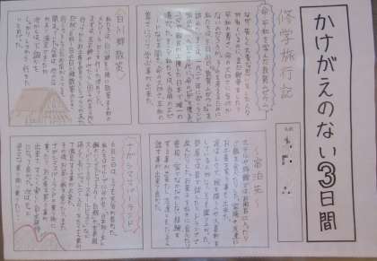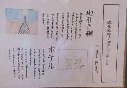 3年生の国語の単元で「文章の種類を選んで書こう」という課題に取り組み、「修学旅行」を題材として、「伝えること」「表現すること」を考え、ふさわしい文章の種類や構成を選んで「修学旅行記」としてまとめた作品を学年の廊下に掲示しています。