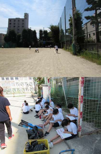 2年2組の体育の授業では、「ソフトボール」のキャッチボールの練習後、ミニゲームをし、続いて最後に教科書を見ながら振返りをしました。