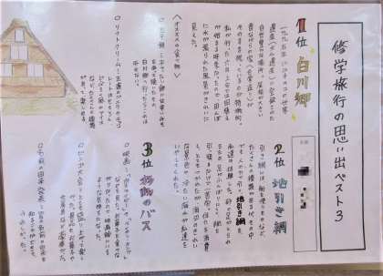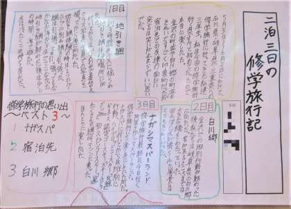 3年生の国語の単元で「文章の種類を選んで書こう」という課題に取り組み、「修学旅行」を題材として、「伝えること」「表現すること」を考え、ふさわしい文章の種類や構成を選んで「修学旅行記」としてまとめた作品を学年の廊下に掲示しています。