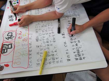 1組の生活の授業では、夏休みの課題として昭和時代の生活を家族にインタヴューした結果を令和時代と比較し、学校祭(文化の部)で発表するための作品作りをしました。