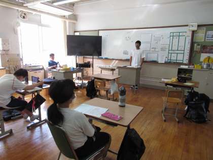 1組の国語の授業では、学校祭(文化の部)のプログラム、「わたしの主張」(テーマ“自分のこと”、1年Nさん)や「英語科発表」(宮沢賢治作“注文の多い料理店”英語版の音読、3年Kさん)の練習などを行いました。