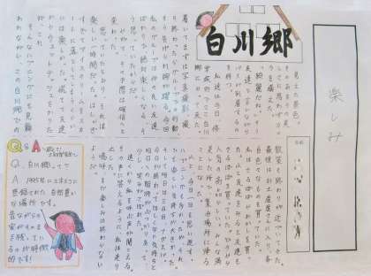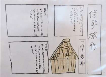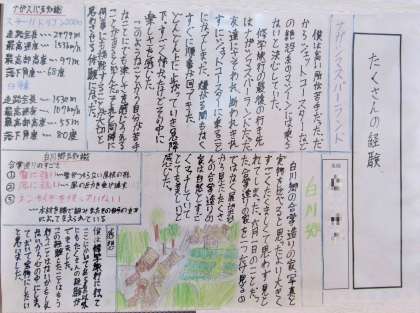3年生の国語の単元で「文章の種類を選んで書こう」という課題に取り組み、「修学旅行」を題材として、「伝えること」「表現すること」を考え、ふさわしい文章の種類や構成を選んで「修学旅行記」としてまとめた作品を学年の廊下に掲示しています。