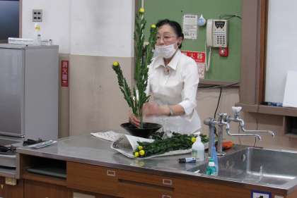 高さや向き、花や葉など一見同じように見えるところを細かく観察し、生花の生け方に則って、お手本どおりに生けていきました。