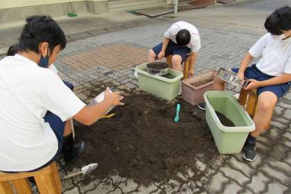 1組の生活の授業では、冬野菜の種まきに向けて、土ふるいをしました。後日、石灰と化学肥料を混ぜる予定です。