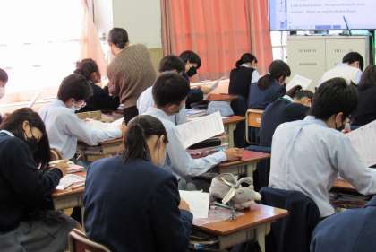 2年2組の英語の授業では、スピーキングテストに向けての準備に続いて、教科書のメグのプレゼンの内容の要点を掴みました。