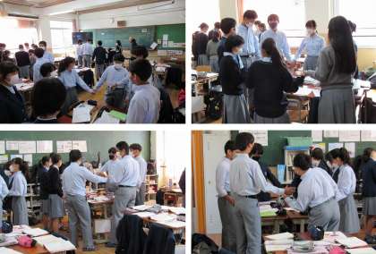 2年3組の理科の授業では、グループ内で手をつないで順番に握った手に力を入れて伝達をしていき、ストップウォッチを持った最後の人が到達時間を測り、その反応時間の短さを競うという実験を通して、運動神経と感覚神経について学習しました。