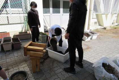 1組の生活の授業では、これまで育ててきた作物の収穫が終わったので、それらを抜いてプランターの整理をしました。