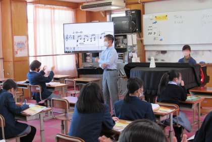 1年2組の音楽の授業では、「三木露風作詞、山田耕筰作曲“赤とんぼ”」の曲の解釈や指揮法を学びました。