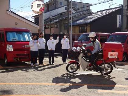 掲示物を作ったり、配達の見送りをしたりと、いろいろな体験をさせていただいています。昨日は、学校に郵便物を配達してくれました。
