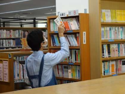 書架に本を戻したり、オススメ本のPOPを作ったりしています。