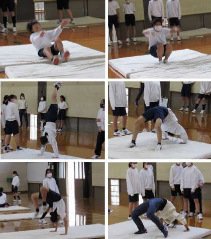 1年4組の体育は、「マット運動」の各種目を練習しました。